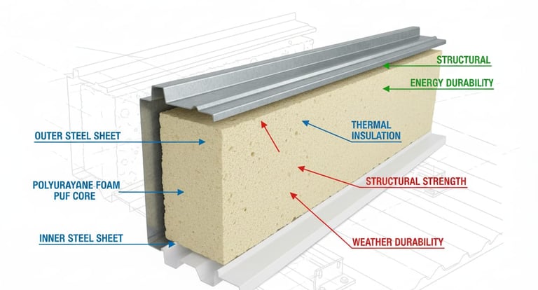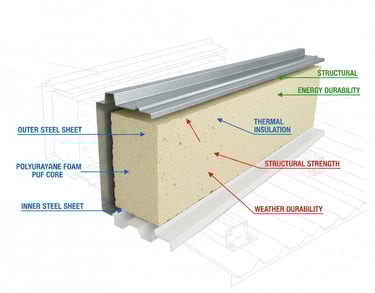 At Pyramid Roofing, we believe a roof should do more than just cover a building—it should control the environment within it. Our Sandwich PUF (Polyurethane Foam) Panels are the ultimate solution for thermal insulation and acoustic control.